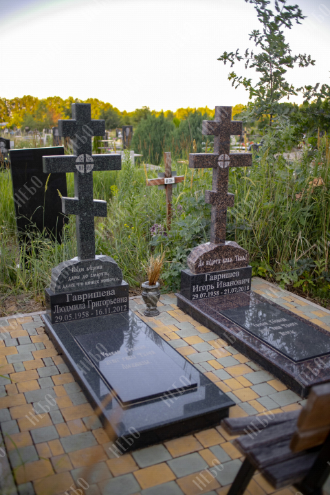 Памятник для родителей, сочетающий в себе два идентичных ритуальных изделия с гранитным крестом. Семейное захоронение выполнено на одной площадке, памятник совмещает закрытое гранитное надгробие и возвышающийся над ним фигурный крест с небольшим основанием у подножья. Правильная прямоугольная форма плиты выглядит лаконично и сдержанно, а ее гладкая поверхность позволяет расположить эпитафию. Соотношение форм, размеров и объемов ритуального изделия исключает его просадку и искажение со временем. Такой памятник будет выделяться среди прочих и не потребует особого ухода.
