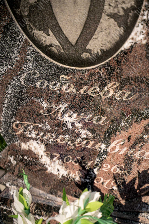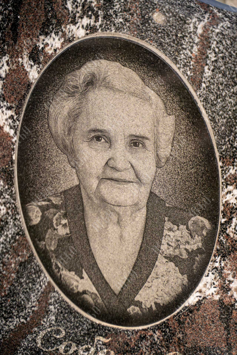 Фото на ритуальном изделии изготовлено методом гравировки алмазными иглами на черном граните. Далее фотография вставлена в памятник из выбранного материала, создавая эффект контрастности. Такой способ вставки изображения применяется в случае изготовления памятника из материалов светлых, серых, коричневых и других оттенков, гарантируя фотографии четкость и наилучшее качество, а готовому изделию долговечность. Благодаря использованию технологии гравировки на граните, фото не потускнеет со временем, не исказится и сохранит первозданный вид десятки лет.