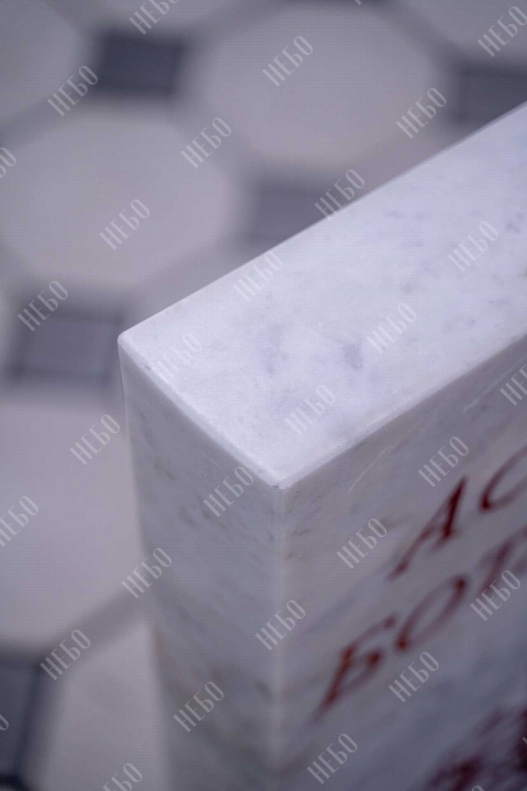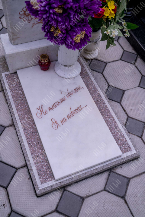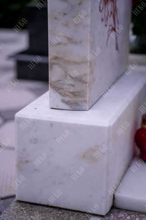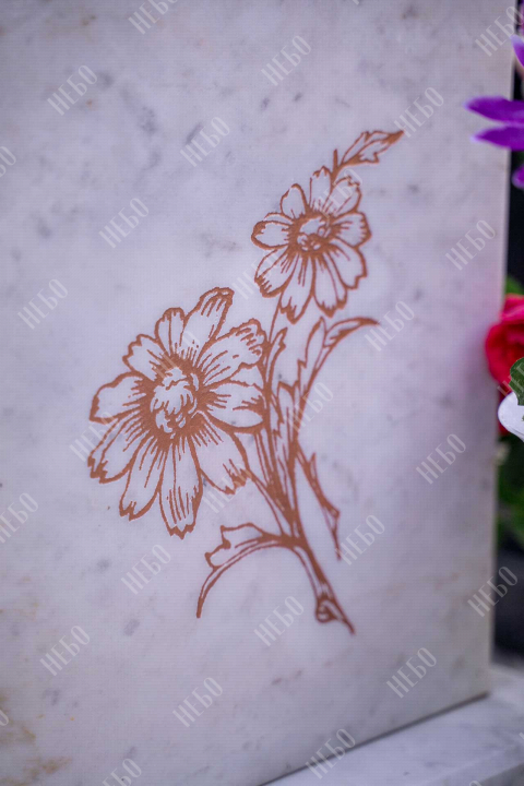 Данное ритуальное изделие изготовлено без изображения фотографии усопшего. Стелла памятника содержит изображение ангела и информацию о покойном, нанесение которой выполнено алмазными иглами на современном оборудовании. Использование технологии такой гравировки исключает любые деформации текста, он не подвержен стираемости и виден в любую погоду. Данный памятник служит отличным примером тому, что и без нанесения фотографии ритуальное изделие может выглядеть достойно и презентабельно, соответствуя всем религиозным канонам.